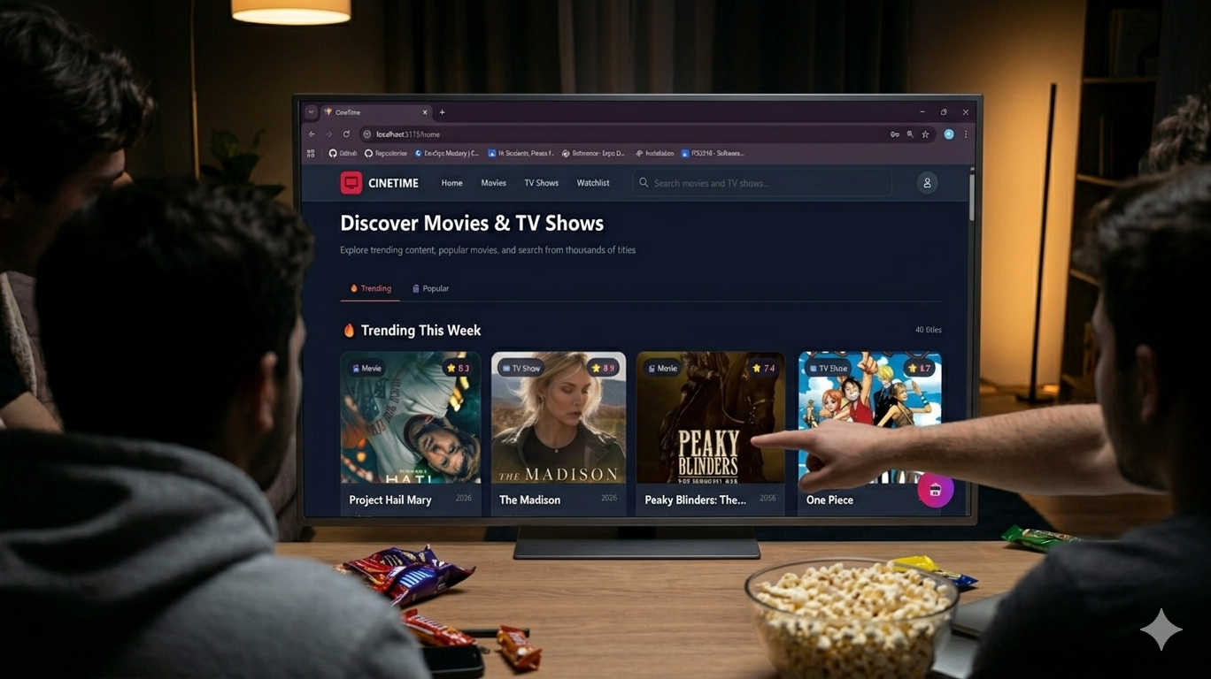 CineTime is a premium, full-stack MERN application designed for cinema enthusiasts to discover, track, and analyze their movie-watching habits. Featuring a high-end Crimson Cinema dark theme, the platform offers secure authentication, real-time media discovery via TMDB, and AI-powered insights.